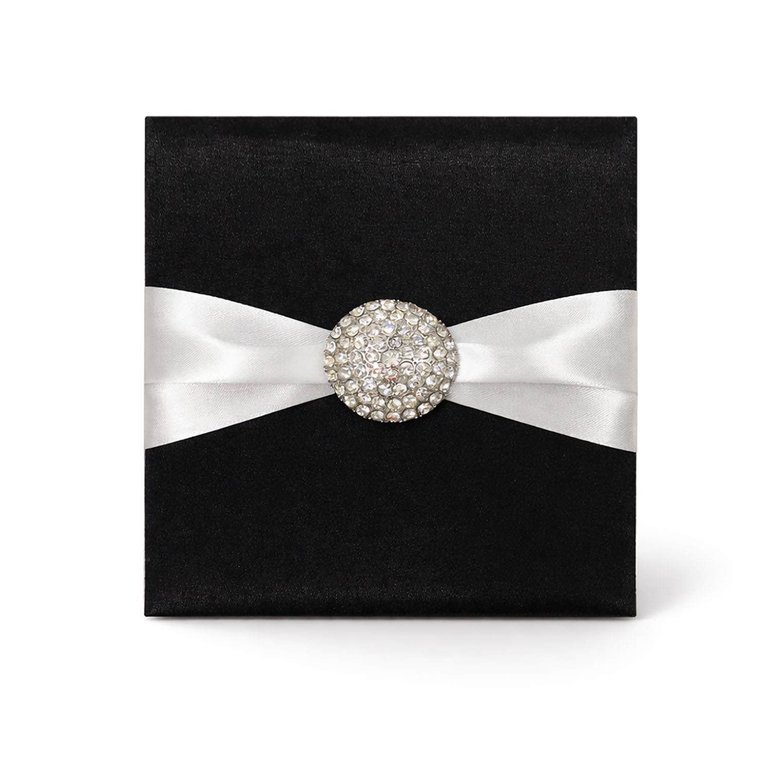 Crafted by hand in Thailand from sumptuous black faux silk, this elegant pad features a striking silver-plated brooch adorned with sparkling rhinestones at its centre. A generous ivory ribbon, approximately two inches wide, adds a refined finishing touch that complements both classic and contemporary wedding themes. The front of the pad is gently cushioned, providing a soft, dimensional backdrop that makes your invitation truly stand out. Explore more custom options on our blog.