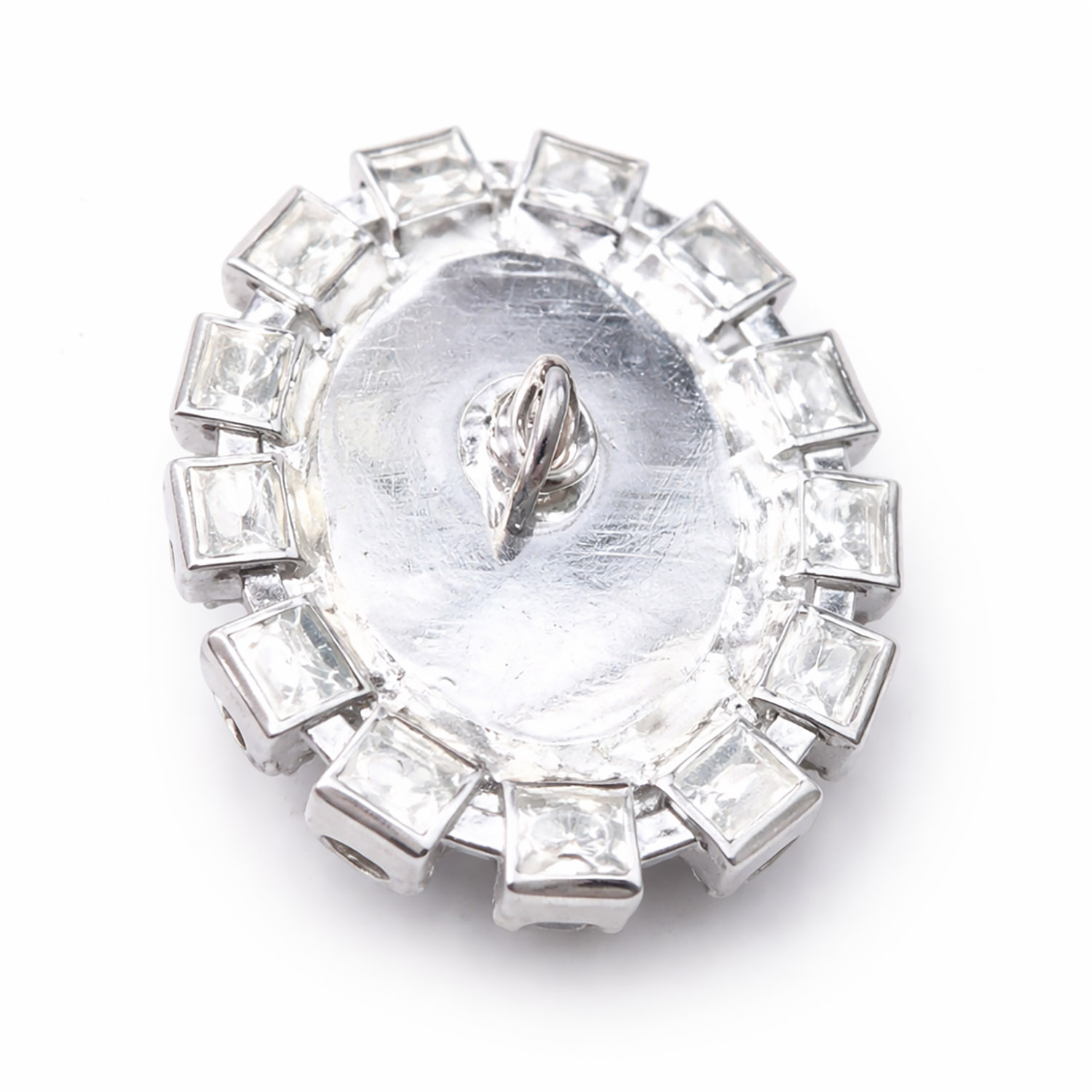 The brooch is finished in a smooth silver plated oval setting, offering a polished and elegant shine that complements silk, satin, velvet, and fine paper materials beautifully.