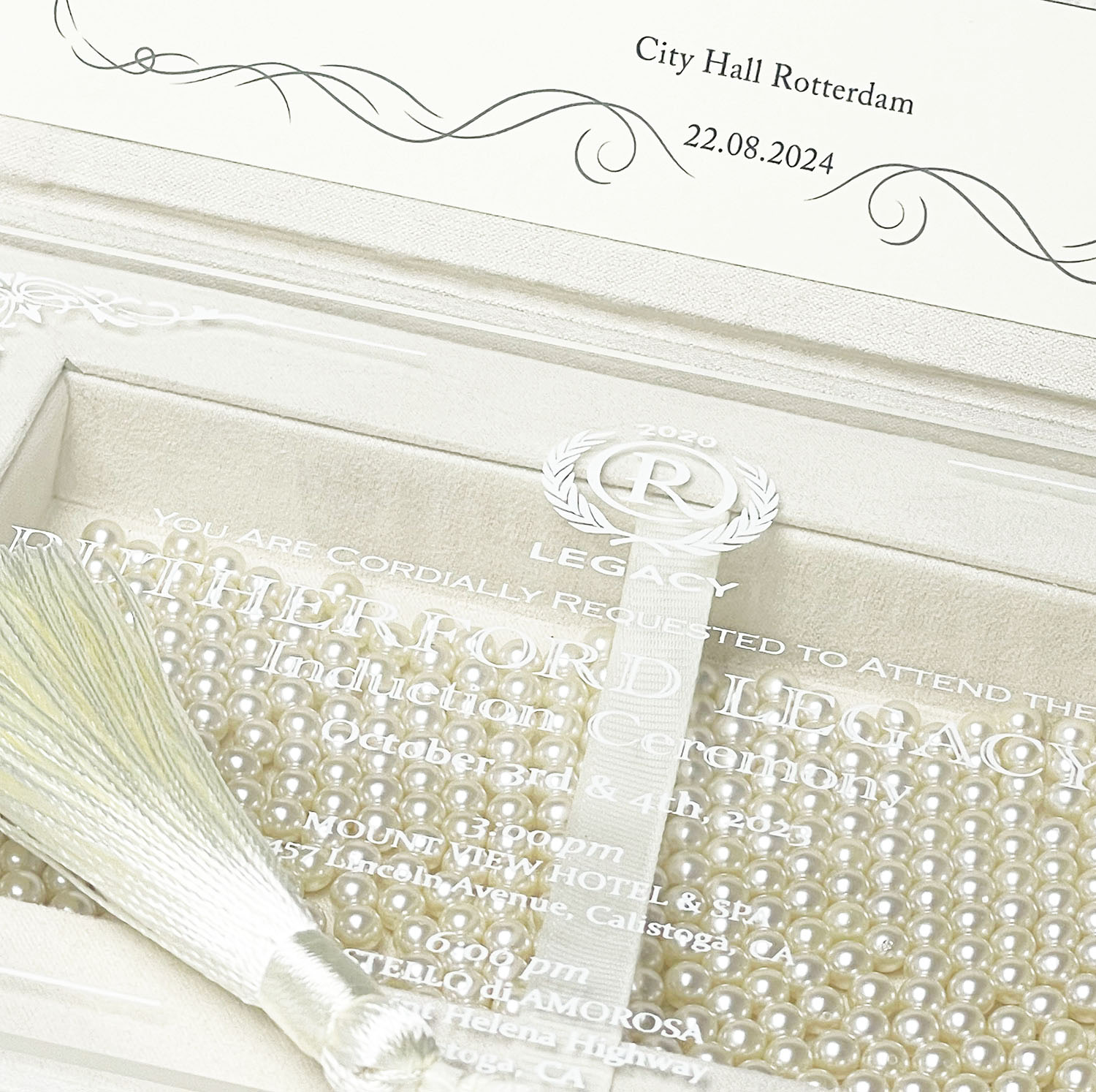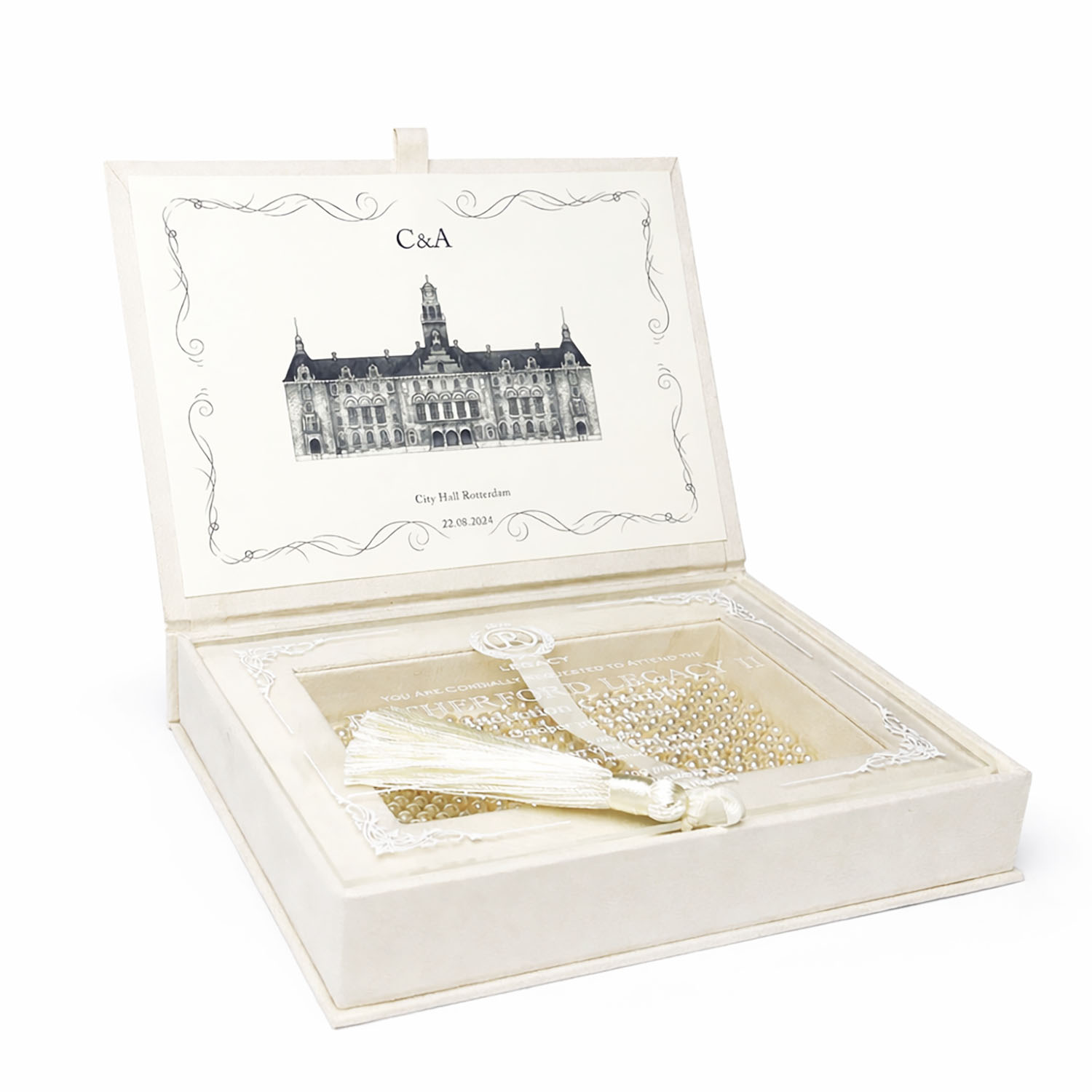 • Additional Features: Optional grosgrain ribbon pull-out, matching tassel, pearl decorations, and acrylic card