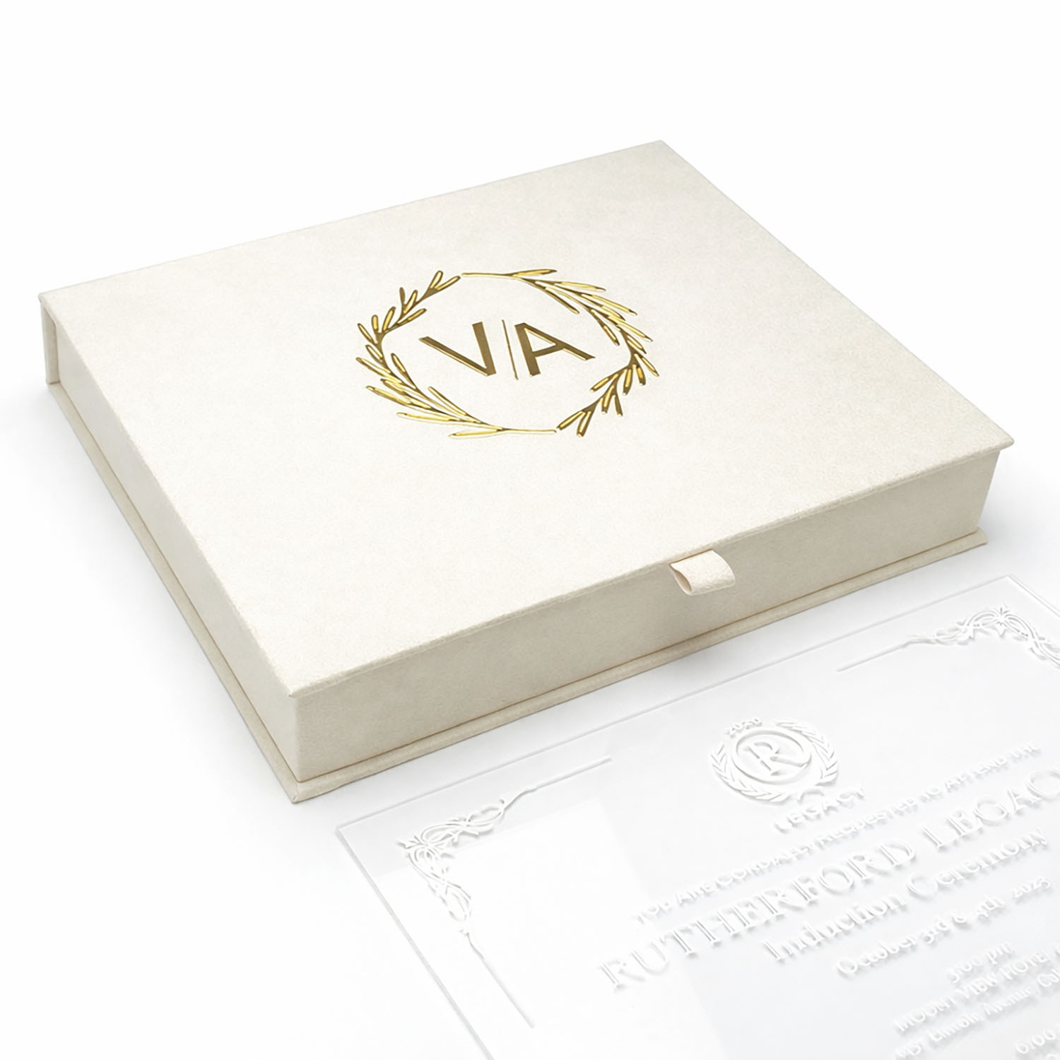 For a truly personalized touch, we can print the wedding venue details, custom text, foil-stamped designs, or any artwork of your choice behind the lid. The design possibilities are endless, making this box a perfect choice for couples seeking a unique and high-end invitation presentation.